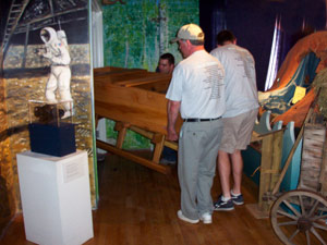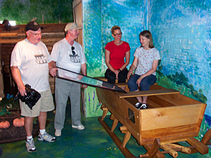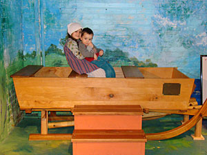 Left: Museum directors receive sled. Right: Sled awaits children.