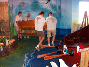 Left: Moving the sled to the third floor. Right: Placing sled in position.