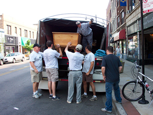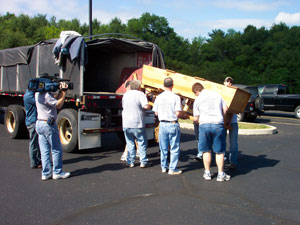 Left: Meeting the truck in Chicago. Right: Museum unloading.