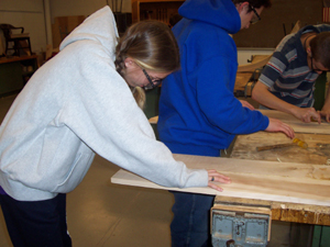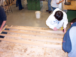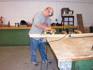 Left: Sanding sled ribbing. Right: Checking sled ribbing.