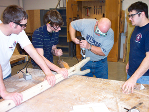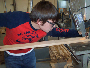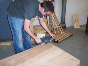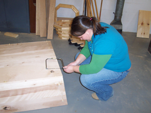 Left: Cutting pegs on sled box. Right: Sanding sled box.