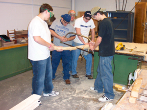 Left: Getting sled drag shaft ready. Right: Cutting sled drag shaft.